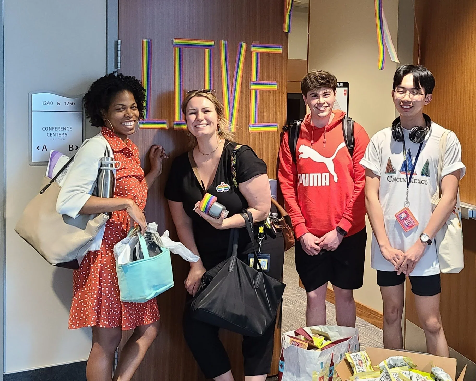 Four smiling young adults standing in front of a colorful 'LOVE' sign at an indoor event, with two carrying bags and snacks, and one wearing headphones